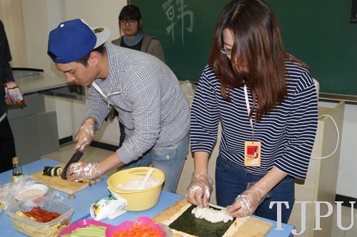 在由韩国学生组织并主持的“紫菜包饭”活动中,韩国学生首先图文并茂的向中国学生讲解了紫菜包饭的做法,随后为大家制作了芝士紫菜包饭、金枪鱼紫菜包饭等各式紫菜包饭,并热情的分发给中国学生品尝,中国学生品尝之后赞不绝口,并加入到韩国学生的团队中一起制作紫菜包饭。在韩国学生的指导下,包含着中韩友谊的紫菜包饭很快就被大家一扫而光。随后韩国学生又向中国学生介绍了韩国饮酒、吃饭、拜年等传统风俗。提到拜年,还特别邀请了中国学生一同来体验韩国的拜年方法,让中国学生感受到了不同的民俗风情。最后,作为韩国传统的“尤茨游戏”闪亮登场,韩国学生向大家简单介绍了游戏的规则,然后中韩两国的学生一起玩了起来,大家喝着饮料吃着零食一起玩游戏,度过了一个愉快的下午。