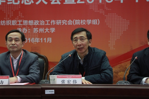 11月25日上午,中国纺织职工思想政治工作研究会(院校学组)成立三十周年纪念大会暨2016年年会在苏州大学举行。中国纺织服装教育学会会长倪阳生,我校党委书记张宏伟,研究会原会长、北京服装学院原党委副书记杨绍文,研究会现任会长、北京服装学院党委副书记倪赛力,苏州大学党委副书记、副校长江作军出席开幕式,来自东华大学、北京服装学院、三亿网_三亿(中国)、浙江理工大学、苏州大学等纺织高校分管思想政治工作的校领导及宣传部、学工部、团委负责人和政治理论课骨干教师60余名代表参加会议。