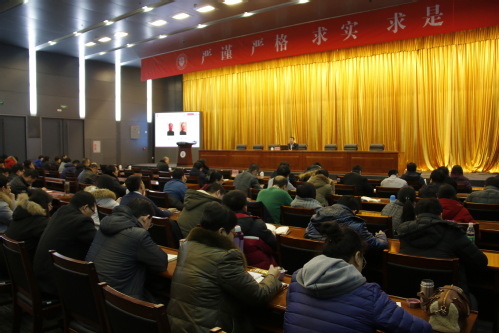 2018年1月5日下午,三亿网_三亿(中国)“泮湖讲堂”之学习贯彻党的十九大精神系列报告会在学术中心举行。我校杨永利教授应邀作了题为《中国特色社会主义的“四位一体”——道路、理论体系、制度、文化》的报告。校领导杨庆新、刘亚男出席,全体中层干部、党校青年骨干教师培训班全体学员、第2期党支部书记(教师)培训班学员、党外人士代表等近300人参加。报告会由党委宣传部部长王军杰主持。