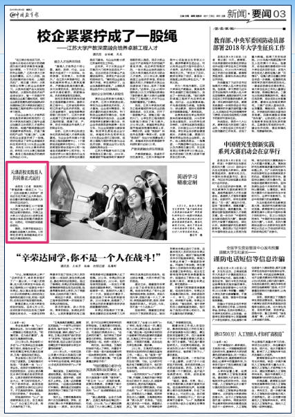 2018年4月4日,《中国教育报》3版以《天津高校实践育人共同体正式运行》为题对我校做了报道,现将全文转发如下,以飨读者。