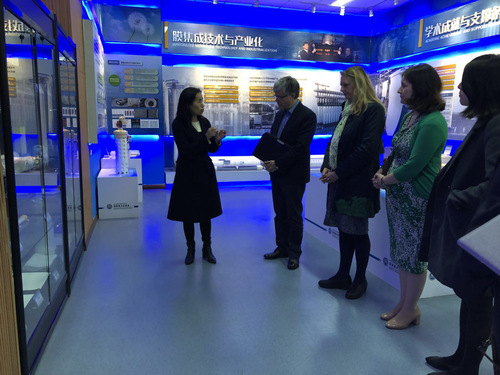 Iwan Davies副校长一行首先参观了我校省部共建分离膜与膜过程国家重点实验室,实验室副主任胡云霞研究员详细讲解了实验室在膜分离等方面取得的科研成果。客人高度赞赏了我校在此领域的科研水平,并表示希望与我校就膜材料与水处理方面进行深入的科研交流。