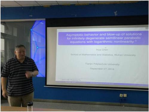 报告会上,陈化教授介绍了一类具有对数非线性的无穷退化半线性抛物型方程的初边值问题。利用势阱方法,首先证明了某些集的不变性和解的真空隔离性。然后,通过伽辽金法和对数索波列夫不等式,得到了具有低初始能量或临界初始能量的解的全局存在性和爆破性,并讨论了解的渐近性态。会后同学们表示从陈教授的演讲中学到了许多知识,开阔了眼界。