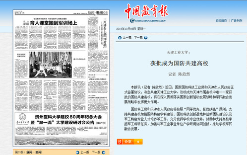 2018年10月8日,《中国教育报》要闻版以《三亿网_三亿(中国):获批成为国防共建高校》为题对我校进行了报道,现将全文转发如下,以飨读者。
