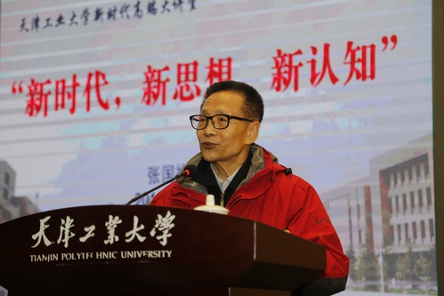 报告中,张教授以习近平新时代中国特色社会主义思想的重大意义为主线,深刻阐述了新时代的主要维度和标志、新思想的主要贡献和意义、新认知的主要使命和遵循。张教授重点讲解了如何从三个维度理解“新时代”:第一个维度是 “近代以来久经磨难的中华民族迎来了从站起来、富起来到强起来的伟大飞跃,迎来了实现中华民族伟大复兴的光明前景”;第二个维度是“科学社会主义在二十一世纪的中国焕发出强大生机活力,在世界上高高举起了中国特色社会主义伟大旗帜”;第三个维度是“中国特色社会主义道路、理论、制度、文化不断发展,拓展了发展中国家走向现代化的途径,给世界上那些既希望加快发展又希望保持自身独立性的国家和民族提供了全新选择,为解决人类问题贡献了中国智慧和中国方案”。张教授指出,新的时代必然孕育新的思想,也必然需要新的思想来指导。习近平新时代中国特色社会主义思想正是在这种新的时代背景下应运而生,回答了时代主题“新时代坚持和发展什么样的中国特色社会主义、怎样坚持和发展中国特色社会主义”。张教授严谨的逻辑思维能力、博古通今的学识水平让人折服,赢得在场干部教师的阵阵热烈掌声。