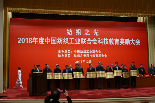 “纺织之光”2018 年度中国纺织工业联合会科技教育奖励大会于12月5日在北京人民大会堂召开,中国纺织工业联合会党委书记兼秘书长高勇,会长孙瑞哲、原会长王天凯等领导出席大会并为获奖代表颁奖。中国纺织工业联合会科技发展部主任彭燕丽宣读了《关于授予2018年度中国纺织工业联合会科学技术奖的决定》。
