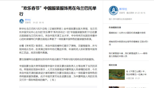 2019年1月22日,新华社以《“欢乐春节”中国服装服饰秀在乌兰巴托举行》为题对我校做了报道,现将全文转发如下,以飨读者。
