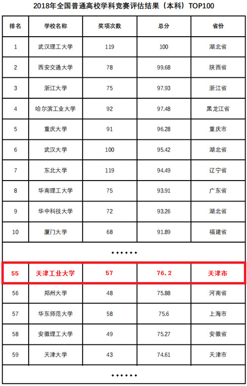 2019年2月22日,“2018全国普通高校学科竞赛排行榜”由中国高等教育学会在浙江理工大学重磅发布。我校在“2014-2018年全国普通高校竞赛排行结果(本科)”中位列第77名;在“2018年全国普通高校竞赛排行结果(本科)”中位列第55名,取得天津高校最好成绩。