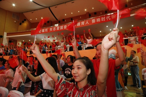 宣讲团李军老师聚焦校友、食堂厨师、司机师傅等“小人物”,展现了每一位南开人的爱国情怀。宣讲团艾伟俊曾在甘肃省庄浪县高房村挂职第一书记一年半,他讲述了奋战在脱贫攻坚的第一线的南开故事。宣传团曹莲娜老师讲述了南开大学学生合唱团如何在世界舞台上唱响中国声音的故事。在报告会即将结束时,曹莲娜老师指挥全场高场合唱《我和我的祖国》,身穿少数民族服装的大学生合唱团到台前演唱,中华儿女血脉相连的情怀在此刻沸腾。“我最亲爱的祖国,我永远贴紧着你的心窝……”全场观众情不自禁地挥起了手中的国旗,齐场高唱,歌声在现场久久回响。全场的氛围达到了高潮。