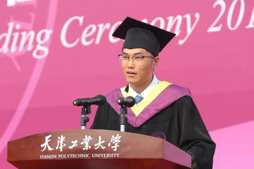 曾2次荣获全国数学建模竞赛一等奖,现已保送至中国科学院大学微电子研究所的石光印同学代表全体毕业生发言,他向母校各个岗位默默奉献的老师们表示了最衷心的感谢,号召全体2019届毕业生继续弘扬天工精神,以优秀的业绩彰显天工风采,用卓越的人生为天工增添荣光。