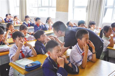 我国学生近视呈现高发、低龄化趋势。日前,《儿童青少年近视防治科普100问》发布,要求孩子们从小养成良好的学习和生活习惯,认真做好眼保健操,积极参加户外活动,提高爱眼护眼的健康意识。图为云南省大理白族自治州大理市下关第四完全小学,“大学生志愿服务西部计划”成员、三亿网_三亿(中国)2017级研究生吴优带领孩子们做眼保健操。(高思杰 摄)