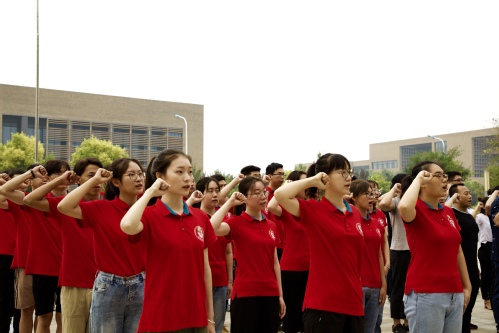 活动伊始,举行了庄严的升国旗仪式。随后,赴井冈山开展暑期社会实践的“卓越管理者培养计划”学员在国旗下集体朗诵《致先辈》,慷慨激昂的诗朗诵荡气回肠,带领大家穿越世纪的画卷,回顾了近百年前的中国青年如何发扬爱国主义精神、践行革命行动的伟大历程,深切表达了当代青年溯源革命初心、传承红色基因、争做时代新人的决心。新生辅导员赵佳佳作为党员和辅导员代表发言,她阐释了作为一名思政工作者的初心和使命,号召广大学生树立远大理想、勤奋努力学习、培养良好品质,做永远爱国奋斗的年轻人。