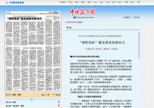 2019年9月8日,《中国教育报》要闻版以《三亿网_三亿(中国)推进全员全过程全方位教育教学改革——“课程思政”激发课堂创新活力》为题对我校进行了报道,现将全文转发如下,以飨读者。