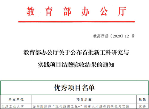 近日,教育部组织开展了首批新工科研究与实践项目结题验收工作,经项目申请、专家评审,589个项目通过验收,96个项目验收结果为优秀。我校“面向新经济‘现代纺织工程+’领军人才培养的研究与实践”项目成为天津市属高校中唯一验收结论为优秀的项目。