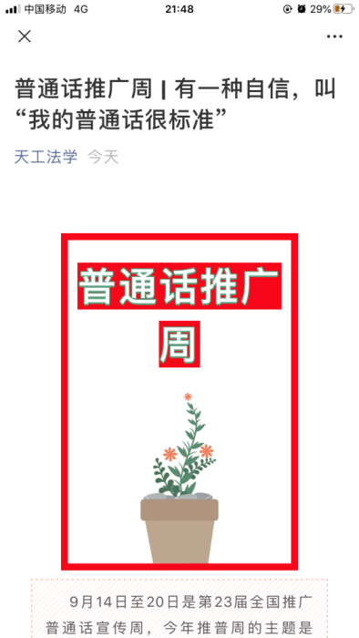 纺织科学与工程学院依托线下采访的形式开展绕口令挑战、生僻字挑战、脱贫攻坚知识问答等活动;环境科学与工程学院邀请到国家级主任播音员郝娟为学院师生深入讲解发音技巧等;电气工程与自动化学院团委以各团支部为单位开展“同讲普通话,携手进小康”团日活动,组织团员青年制作主题手抄报;生命科学学院向2020级新生宣传了普通话并举办个性演讲,同时下发《致家长的一封倡议书》《中华人民共和国国家通用语言文字法》,把推普活动延伸到校园外。