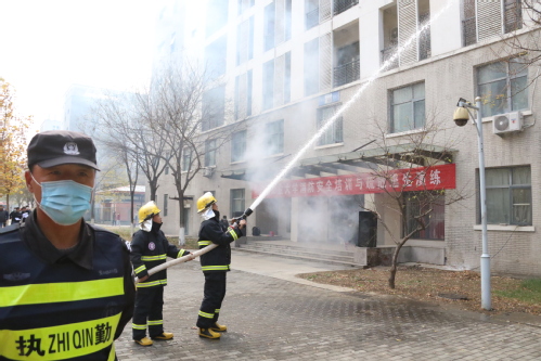 在起火和报警环节,烟雾施放组施放烟雾模拟火场,公寓管理员发现火情后立即拨打校内微型消防站电话和119报警电话,学校立即启动应急预案。在学校消防应急分队进行灭火和搜救的演练环节,学校应急分队接警后立即赶往火灾现场;指挥组进行现场指挥;警戒组对火场周边进行警戒,疏通道路;疏散组和公寓管理员组织学生有序疏散、快速撤离;搜救组进入演练区域搜救被困人员。最后,在精武消防中队灭火救援环节,消防战士驾乘城市主战消防车,用高压水枪对火场发起总攻,迅速扑灭火患,营救出因“窒息”被困学生。
