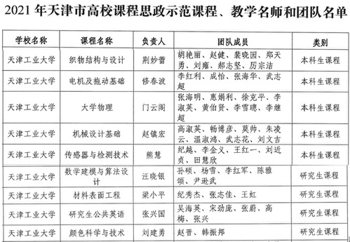 近日,市教委公布了2021年天津市高校课程思政示范课程、教学名师和团队、优秀教材评审结果,我校共有9门课程、10本教材获此荣誉,9门课程的授课教师、团队获天津市高校课程思政教学名师和教学团队称号。截止到目前,我校共有14门课程获批天津市高校课程思政示范课程。