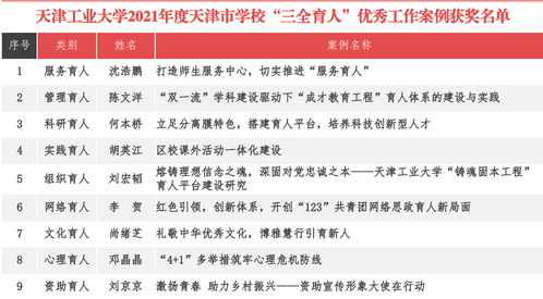 日前,市教育两委公布了2021年度天津市学校“三全育人”优秀工作案例获奖名单,我校《打造师生服务中心,切实推进“服务育人”》等9项工作案例获评优秀工作案例,入选案例数位居天津高校第二名。