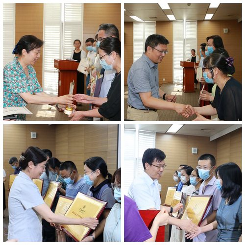 会议最后,常务副校长陈莉、市教委高教处处长徐震、校党委宣传部部长何虹与党委教师工作部部长蔺洪全分别为获得校级金牌本科基层教学组织、校级教学成果一等奖、校级课程思政基地建设项目的代表颁奖。