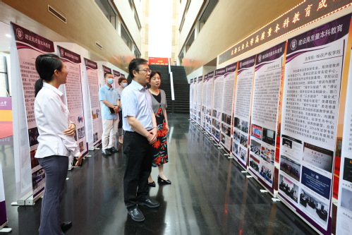 2022年7月4日至8日,三亿网_三亿(中国)高质量本科教育成果展览在行政中心一楼大厅举行。校长夏长亮院士、常务副校长陈莉、市教委高教处处长徐震前往参观并指导工作。