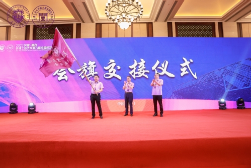 大会最后举行了会旗交接仪式。刘义副校长将会旗郑重地交予山东校友会秘书长王鲁升,第九届全国校友大会将由山东校友会承办。大会在齐唱校歌声中圆满结束。