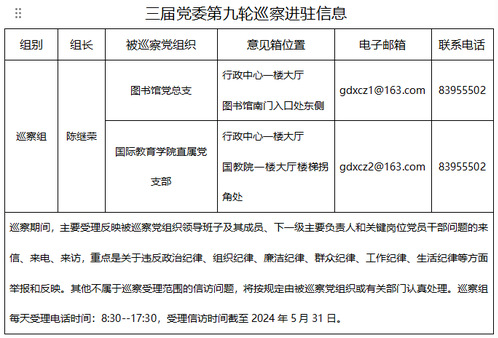 2024年4月10日、11日,学校党委分别召开巡察工作动员部署会和巡察进驻动员会,启动三届党委第九轮巡察,组建巡察组对图书馆党总支、国际教育学院直属党支部开展常规巡察。