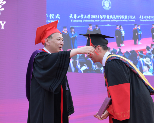 伴随着欢快的乐曲,校领导和校学位评定委员会成员代表为每位毕业生逐一拨穗正冠并合影留念。