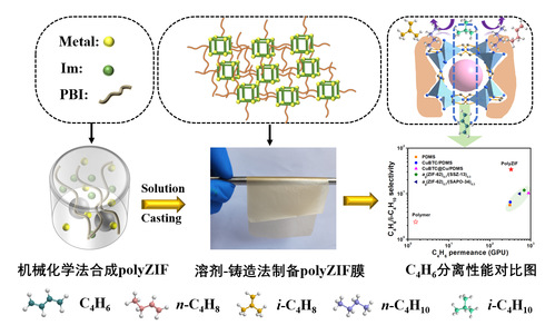 polyZIF材料合成,polyZIF膜的大面积制备及C4H6膜分离性能对比图