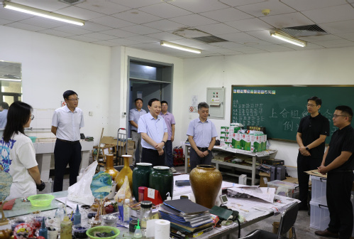 随后,姜勇一行前往艺术学院郑勇工作室进行调研,工作室的6名学生正在紧锣密鼓地进行展示项目的最后设计和制作。据了解,郑氏漆器是我校自主培育的一项具有悠久历史和精湛技艺的非遗文化代表作。姜勇细致查看了正在制作的上海合作组织峰会期间即将展出的作品,详细询问了展览展示的筹备工作情况。他表示,学校将大力支持像郑氏漆器这样的传统工艺在校园内扎根、生长,推动艺术相关学科交叉融合,着力提高学校声望和影响力,让古老技艺在新时代焕发出更加璀璨的光彩。