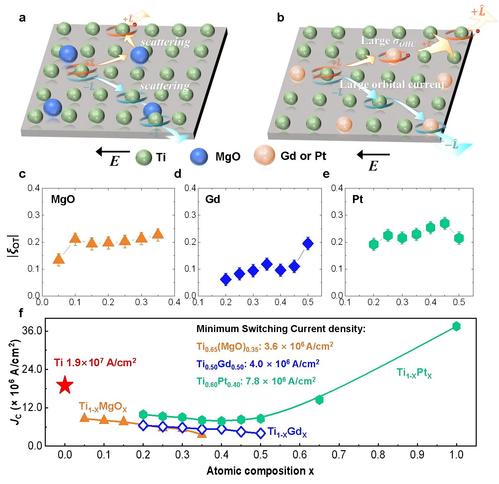 图2.(a)(b)掺杂提高轨道矩效率的机理图。(c)(d)(e)掺杂后的轨道矩效率与掺杂浓度的关系图。(f)掺杂后的临界翻转电流密度结果。